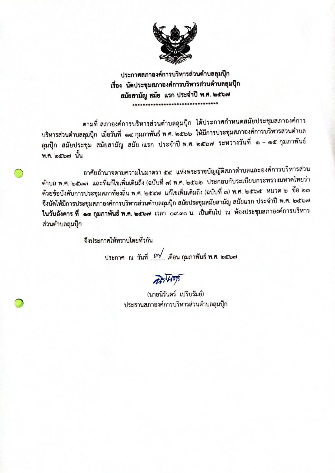 ประกาศ เรื่องนัดประชุมสภาองค์การบริหารส่วนตำบลลุมปุ๊ก สมัยสามัญ สมัยแรก ประจำปี พ.ศ.2567
