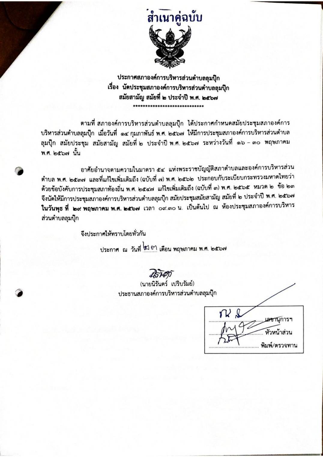 ประกาศ เรื่องนัดประชุมสภาองค์การบริหารส่วนตำบลลุมปุ๊ก สมัยสามัญ สมัยที่ 2 ประจำปี พ.ศ.2567