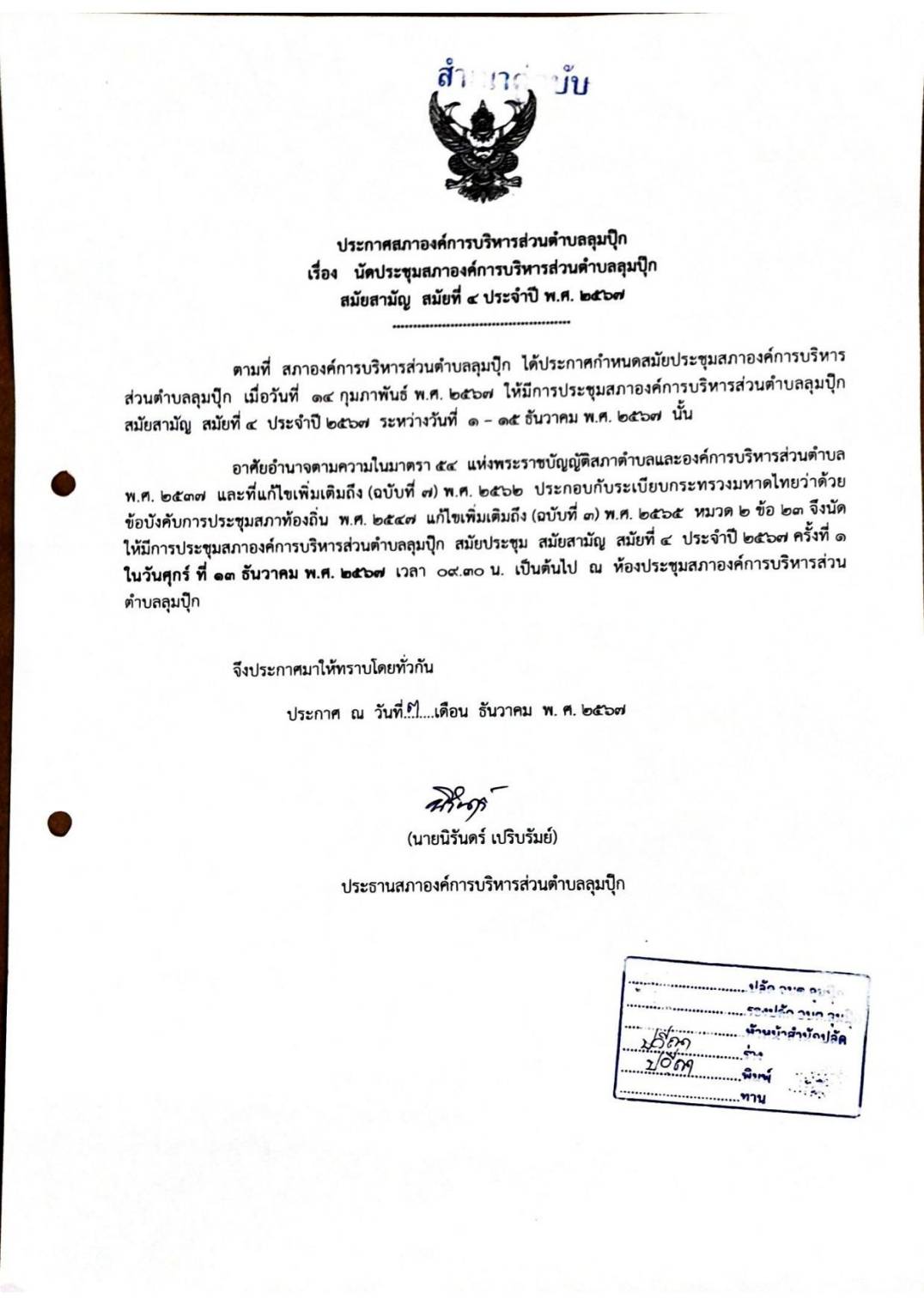 ประกาศ เรื่องนัดประชุมสภาองค์การบริหารส่วนตำบลลุมปุ๊ก สมัยสามัญ สมัยที่ 4 ประจำปี พ.ศ.2567