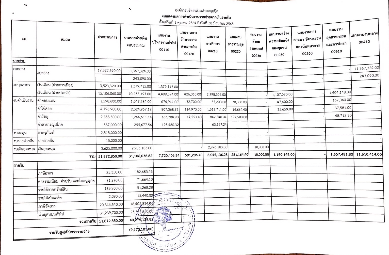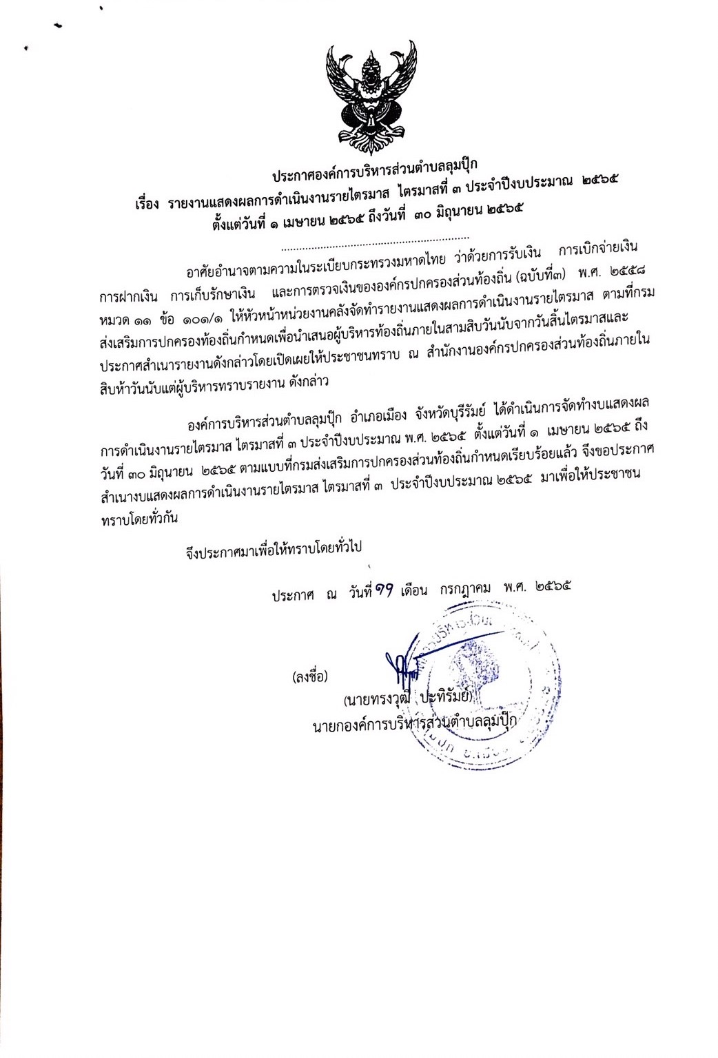 ประกาศเรื่องรายงานแสดงผลการดำเนินงานรายไตรมาส ไตรมาสที่ 3 ประจำปีงบประมาณ 2565