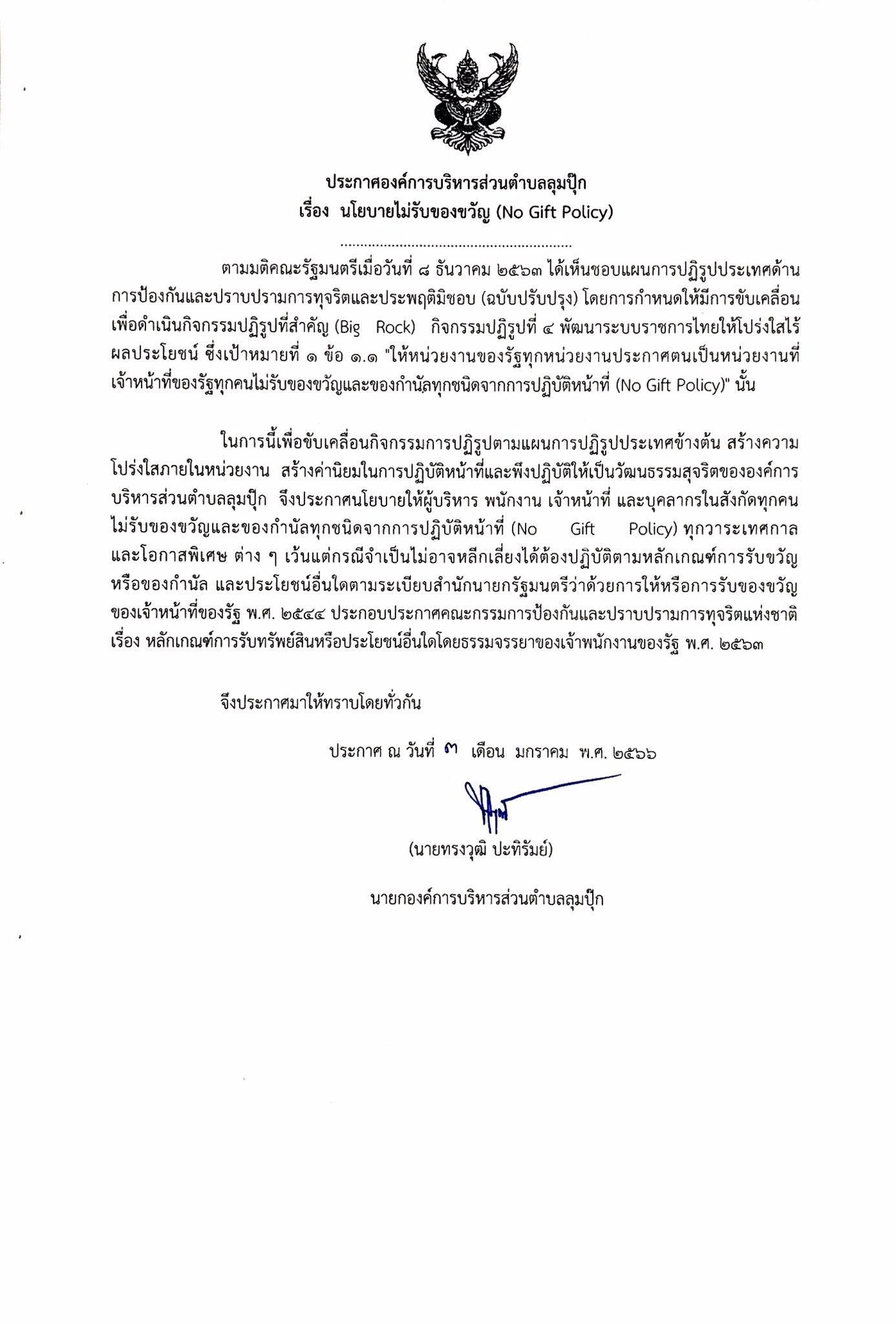 ประกาศนโยบายไม่รับของขวัญ (No Gift Policy) ปี 2566