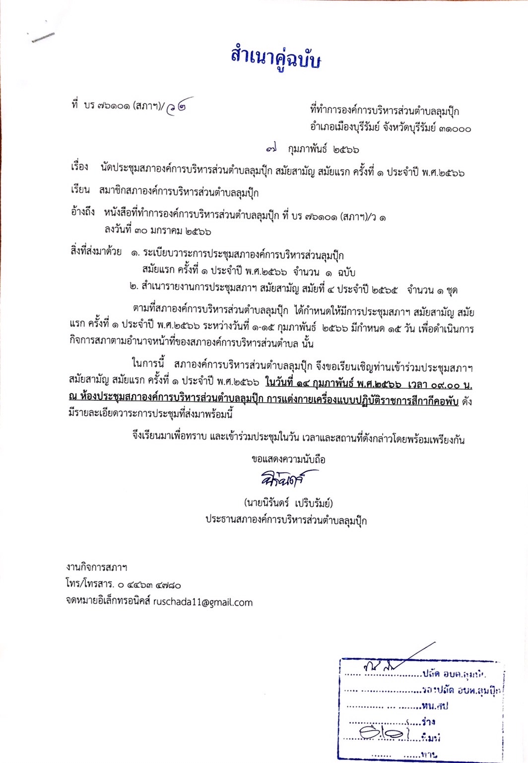 หนังสือส่งนัดประชุมสภาองค์การบริหารส่วนตำบลลุมปุ๊ก สมัยสามัญ สมัยแรก ครั้งที่ 1 ปี 66