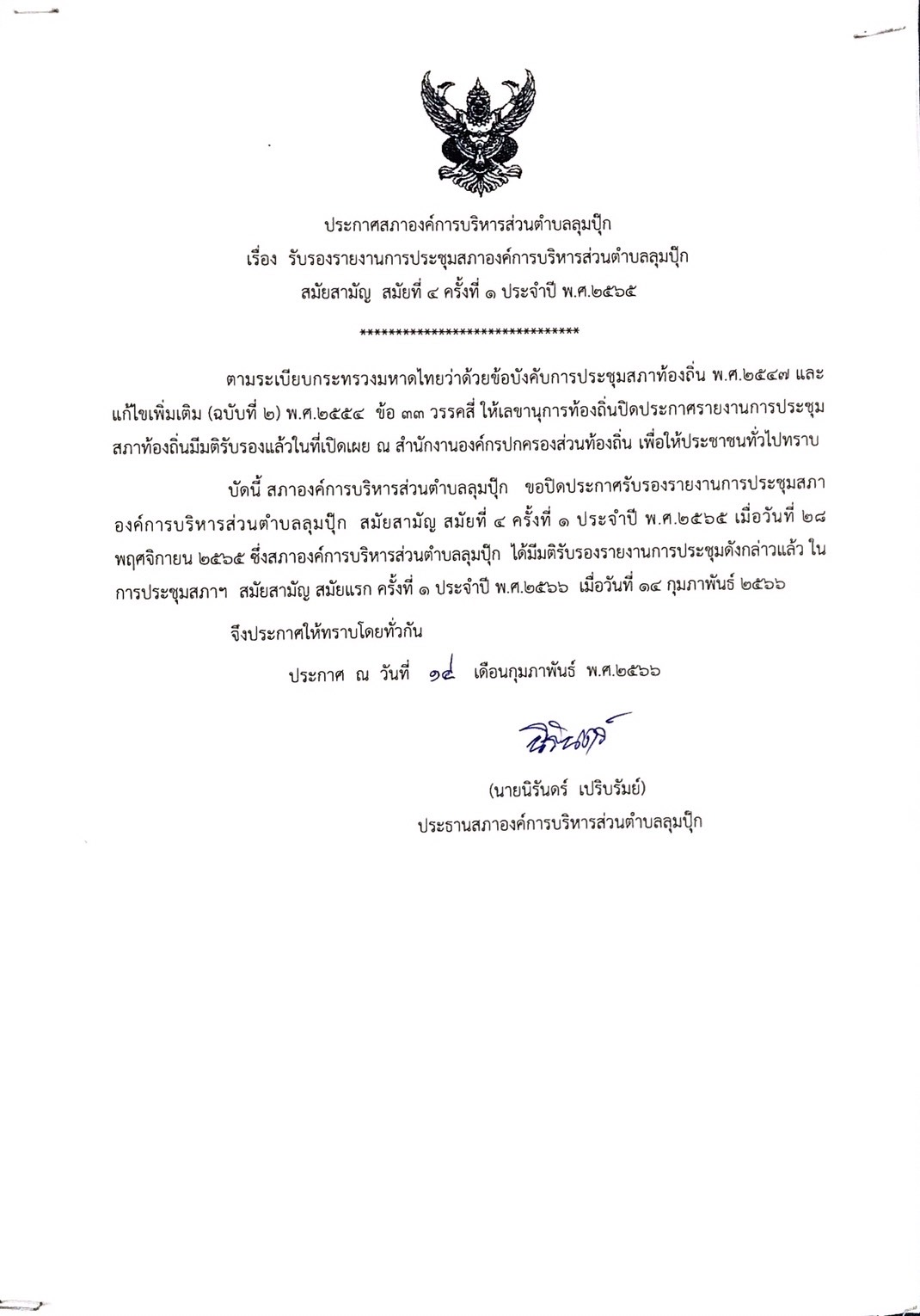 ประกาศรับรองรายงานการประชุมสภาองค์การบริหารส่วนตำบลลุมปุ๊ก สมัยสามัญ สมัยที่ 4 ครั้งที่ 1 ประจำปี 2565