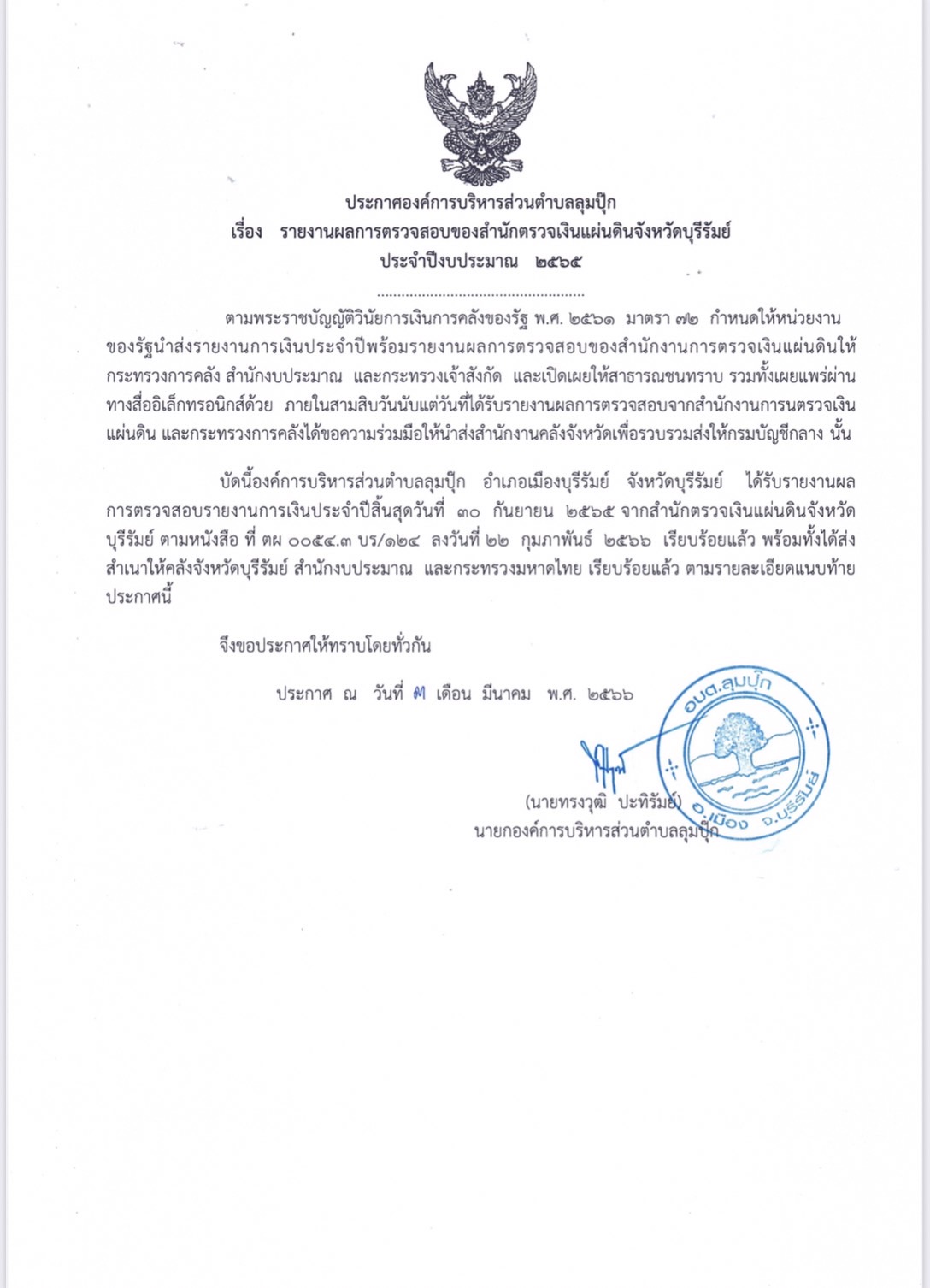 ประกาศ เรื่องรายงานผลการตรวจสอบของสำนักตรวจเงินแผ่นดินจังหวัดบุรีรัมย์