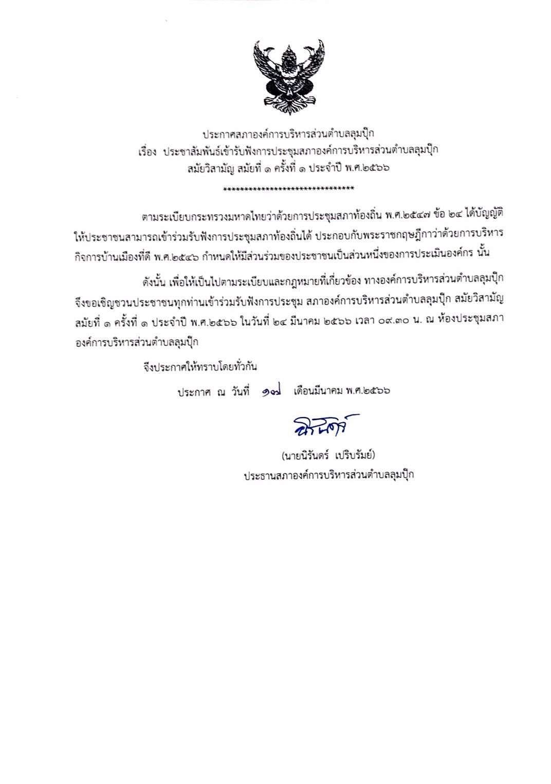 ประกาศสภาอบต.ลุมปุ๊ก เรื่องประชาสัมพันธ์เข้ารับฟังการประชุมสภาฯ สมัยวิสามัญ สมัยที่ 1 ครั้งที่ 1 ประจำปี 2566