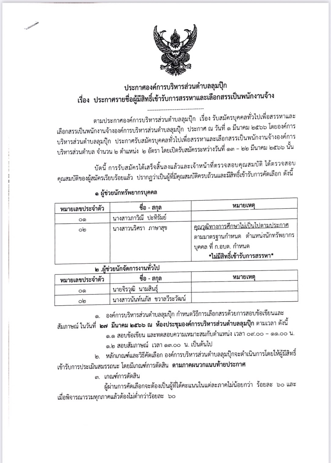 ประกาศอบต.ลุมปุ๊ก เรื่อง ประกาศรายชื่อผู้มีสิทธิ์เข้ารับการสรรหาและเลือกสรรเป็นพนักงานจ้าง