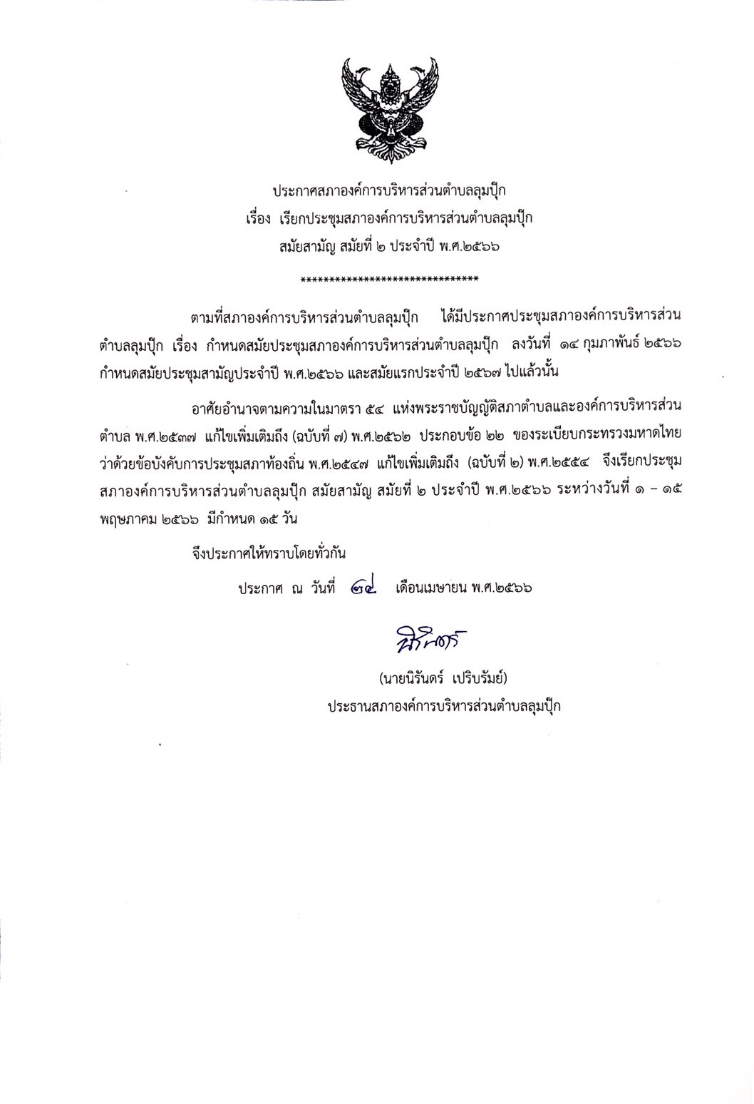 ประกาศสภาองค์การบริหารส่วนตำบลลุมปุ๊ก เรื่อง เรียกประชุมสภาองค์การบริหารส่วนตำบลลุมปุ๊ก สมัยสามัญ สมัยที่ 2 ประจำปี พ.ศ.2566