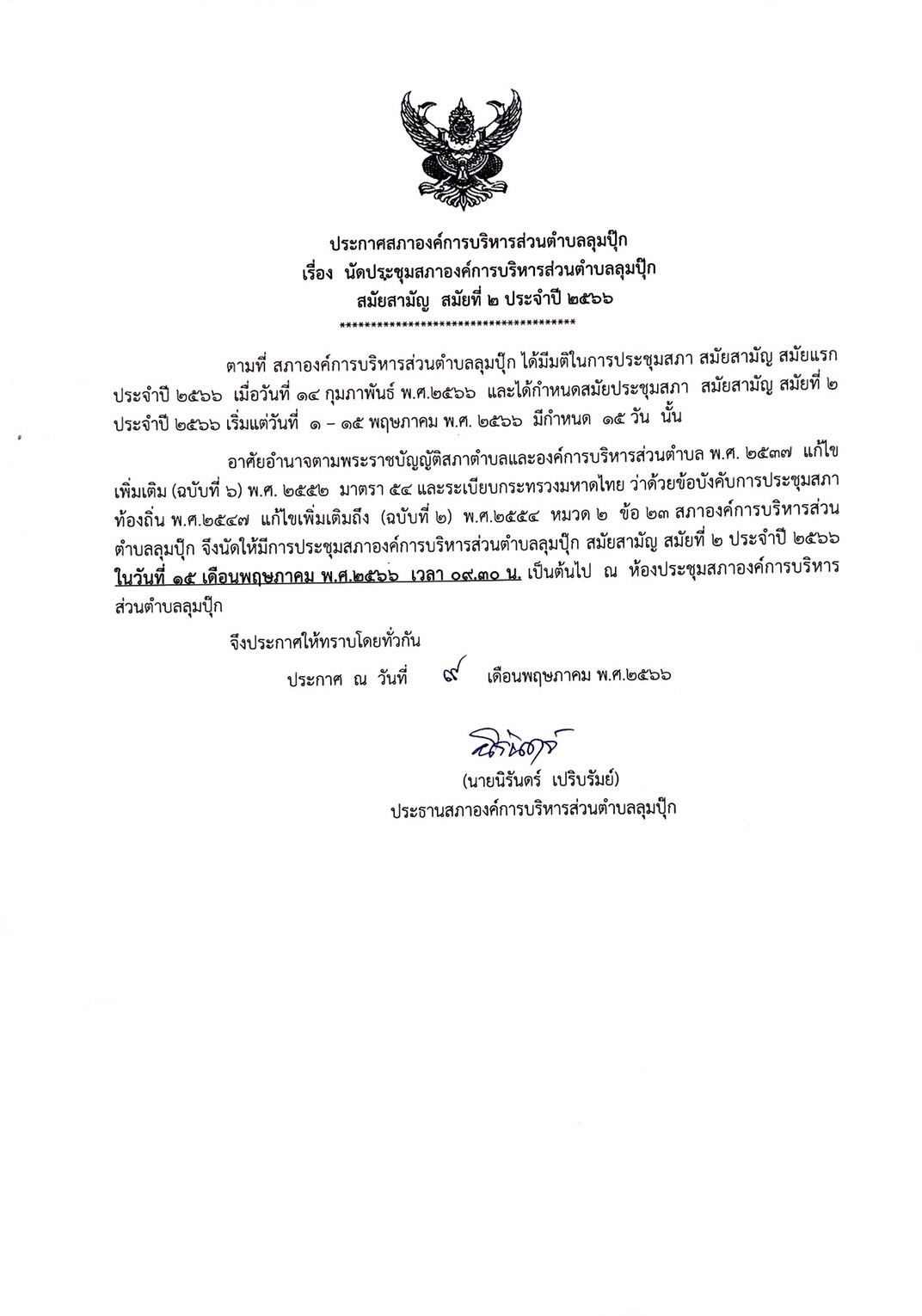 ประกาศอบต.ลุมปุ๊ก นัดประชุมสภา อบต.ลุมปุ๊ก สมัยสามัญ สมัยที่ 2 ประจำปี 2566