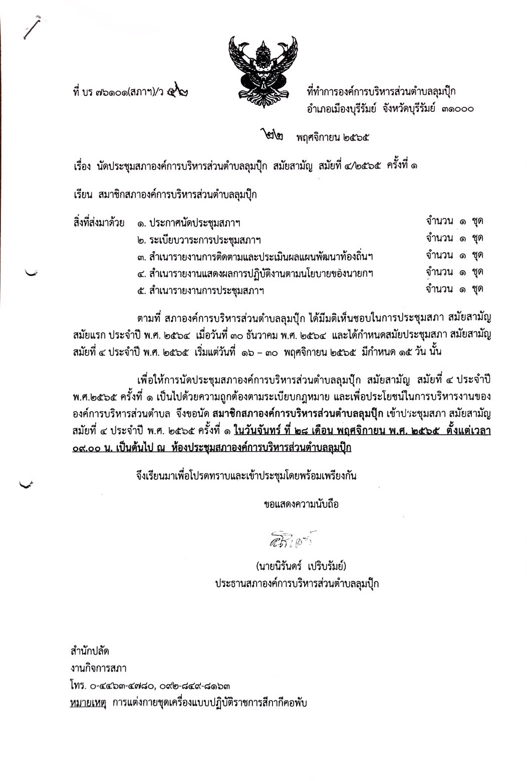นัดประชุมสภา อบต.ลุมปุ๊ก สมัยวิสามัญ สมัยที่ 4/2565 ครั้งที่ 1