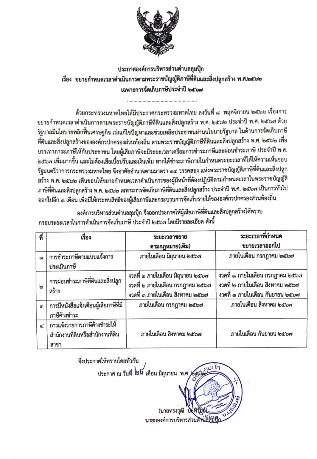 ประกาศ อบต.ลุมปุ๊ก เรื่องขยายกำหนดเวลาดำเนินตามพระราชบัญญัติภาษีที่ดินและสิ่งปลูกสร้าง พ.ศ.2562 เฉพาะการจัดเก็บภาษีประจำปี 2567