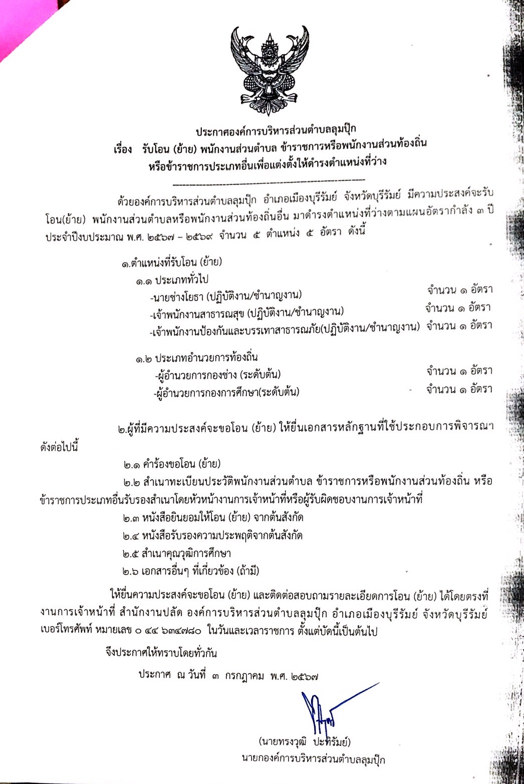 เรื่อง รับโอน(ย้าย) พนักงานส่วนตำบลข้าราชการหรือพนักงานส่งนท้องถิ่นหรือข้าราชการประเภทอื่นเพื่อแต่งตั้งให้ดำรงตำแหน่งที่ว่าง